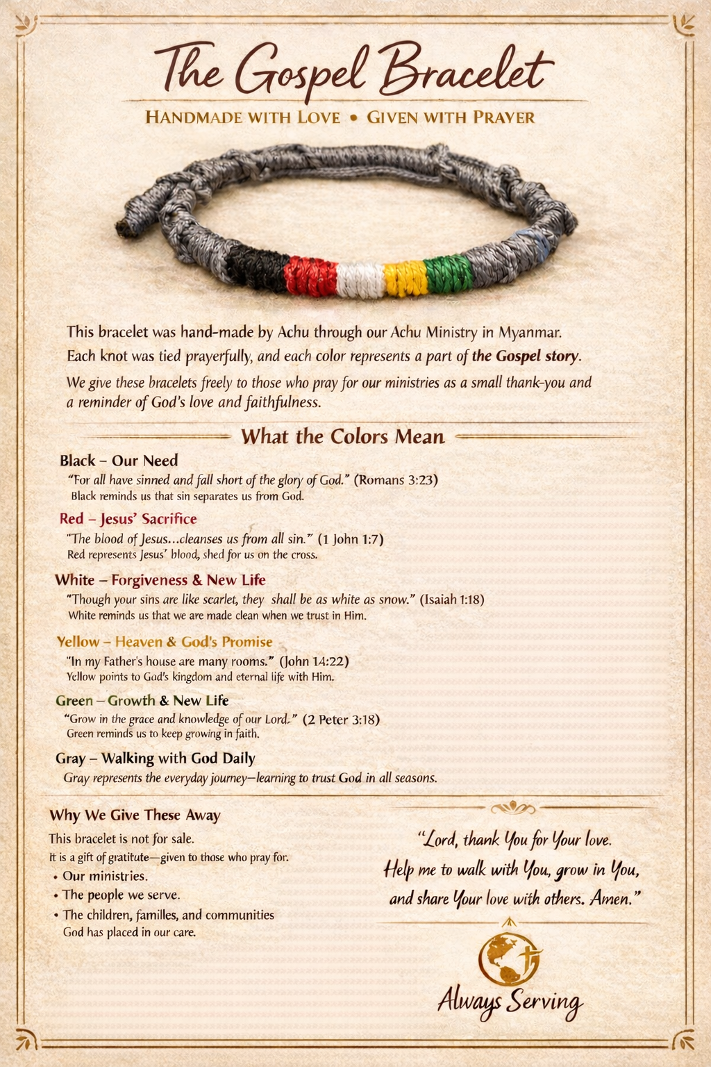 Please email me your name and address and how you were explained the Gospel and which ministry you are praying for and I will send you a bracelet to as many as we have available
